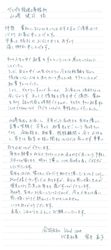 トップ > お客様の声 > 合同会社 Kind care 代表社員 宮本 直子様